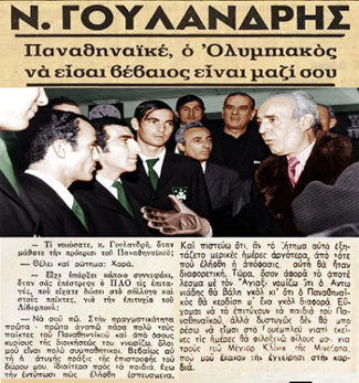 Ιστορικό στιγμιότυπο με ξεχωριστό βάρος. Ο Νίκος Γουλανδρής, εμβληματικός πρόεδρος του Ολυμπιακού, εμφανίζεται σε μια σπάνια στιγμή δημόσιου λόγου προς τον μεγάλο αντίπαλο, τον Παναθηναϊκό, σε μια εποχή όπου οι διοικητικοί ηγέτες είχαν ισχυρή προσωπικότητα και καθοριστικό ρόλο στις εξελίξεις.