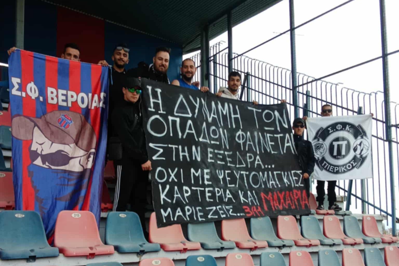 Μια εικόνα, χίλια μαθήματα πολιτισμού! Οι φίλαθλοι της Βέροιας και του Πιερικού έδωσαν το δικό τους παράδειγμα, καθισμένοι δίπλα-δίπλα στις εξέδρες, δείχνοντας ότι ο σεβασμός δεν έχει χρώματα. Το πανό κατά της βίας, αφιερωμένο στη μνήμη του Μάριου από τη Χαλκίδα, συγκίνησε και έστειλε δυνατό μήνυμα ενότητας. Το ποδόσφαιρο μπορεί, και πρέπει, να είναι γιορτή, όπως ακριβώς το έκαναν πράξη οι δύο φίλαθλοι κοινοί.